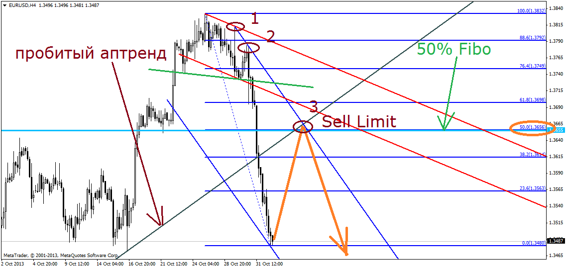 Если перейти на таймфрейм Н4, у нас есть точка 3 нисходящего канала, где также недалеко проходит недельная медиана (жирная красная линия):
