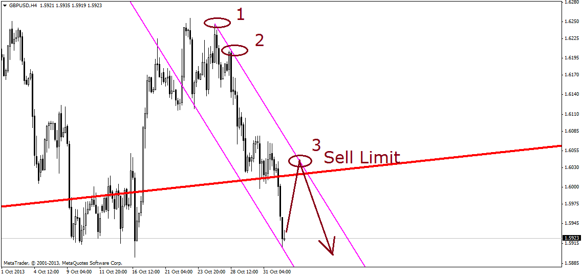 Предварительно Sell Limit 1.6050, Stop Loss 1.6100, Take Profit 1.5750. Но со временем я буду опускать продажу вдоль нисходящего канала.