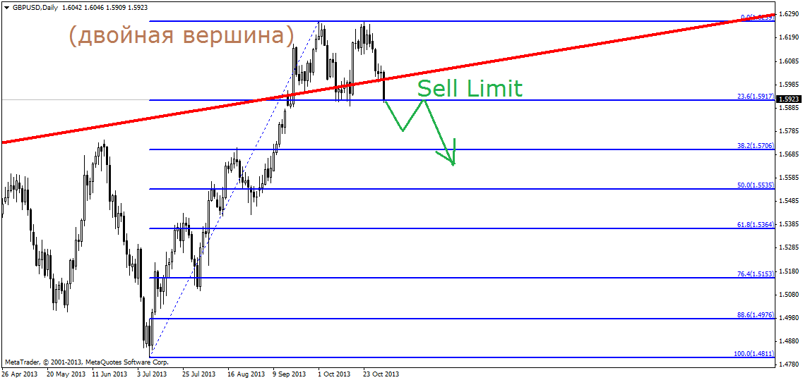 Вторая продажа – после пробития линии шеи на откате двойной вершины (1.5915):