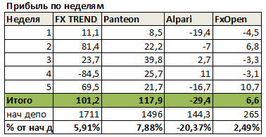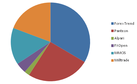Наибольшая прибыль получена на ПАММах Пантеон Финанс, хотя и депозит меньше чем на Форекс Тренд. Управляющие Пантеон работают более ровно, нет суперприбылей за неделю, нет и суперубытков. Поэтому на следующий месяц на Форекс Тренде постараюсь сделать более консервативно-умеренный портфель. Сейчас в нем уже присутствуют AlexZhuk, Investobolin и votfx. Лучше меньшая , но постоянная прибыль, как на Пантеоне - месячный результат будет выше.