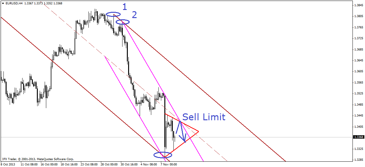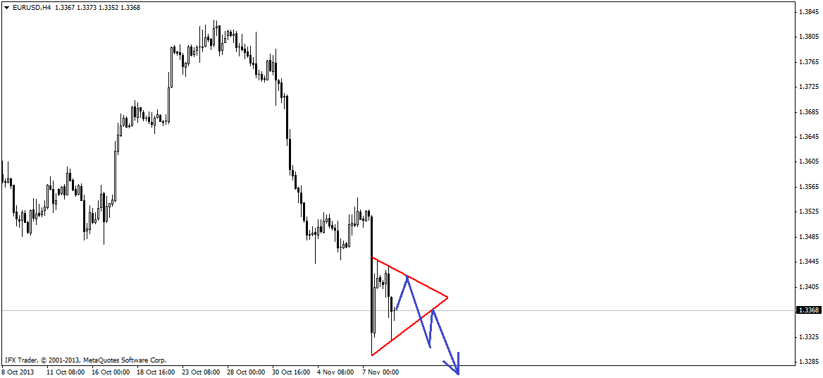 На четырехчасовом таймфрейме у нас сформировался треугольник, но учитывая предыдущую длинную черную свечу, чем-то он напоминает вымпел – фигуру продолжения тренда: