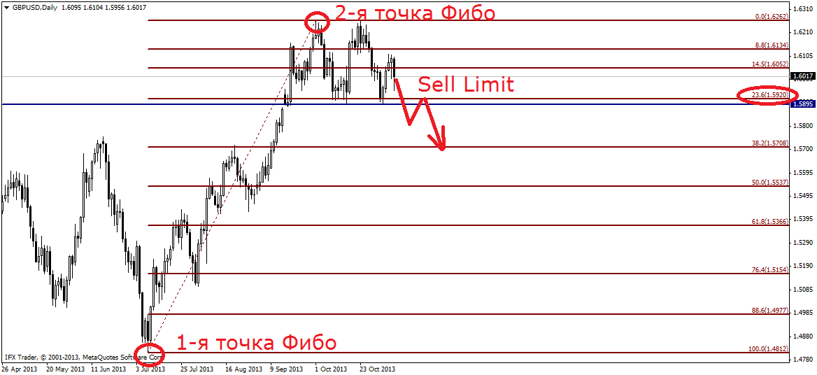 Вторая продажа – это попытка "словить" правое плечо ГиП, плюс у нас также действует правило, что если цена оттолкнулась от 23.6% уровня Фибо, тогда можем искать продажи от уровня 8.8% Фибо. Уровень левого плеча = уровень правого плеча = 8.8% Фибо (слияние уровней):