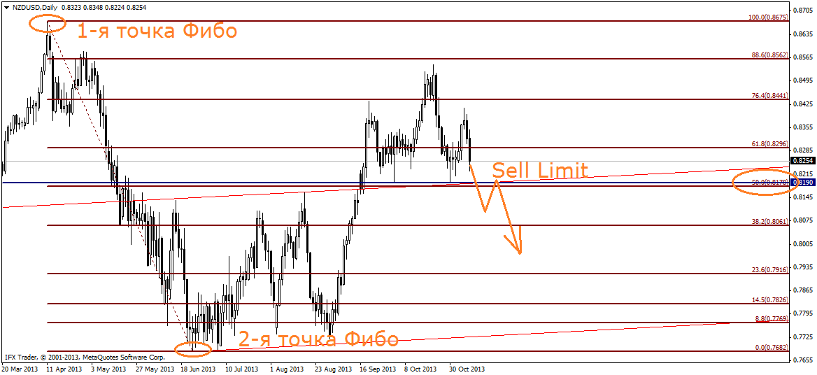 Растянув сетку Фибо на последний импульс, замечаем слияние уровней, поэтому можем рискованно выставить продажу. Почему рискованно? Возможно, слишком низко продаем, по отношению к текущему таймфрейму. Хотя в таких случаях всегда вертится в голове старая трейдерская фраза: "курс никогда не бывает слишком высоким, чтобы начать покупать, и слишком низким, чтобы начать продавать":