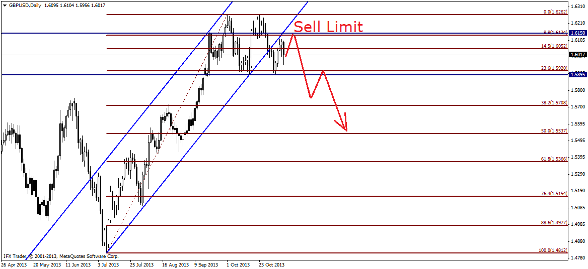 Поэтому Sell Limit 1.6150, Stop Loss 1.6200, Take Profit 1.5925 (линия шеи); 1.5710 (38.2% уровень Фибо, по правилу уровней Фибо "23.6%-8.8%-38.2%"); 1.5540 (высота фигуры = 50% Фибо последнего восходящего движения 1.4812- 1.6262).