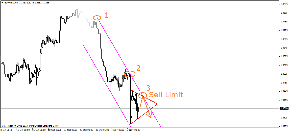 Также через нашу точку 3 проходит серединная линия более пологого даунтренда (истинного):