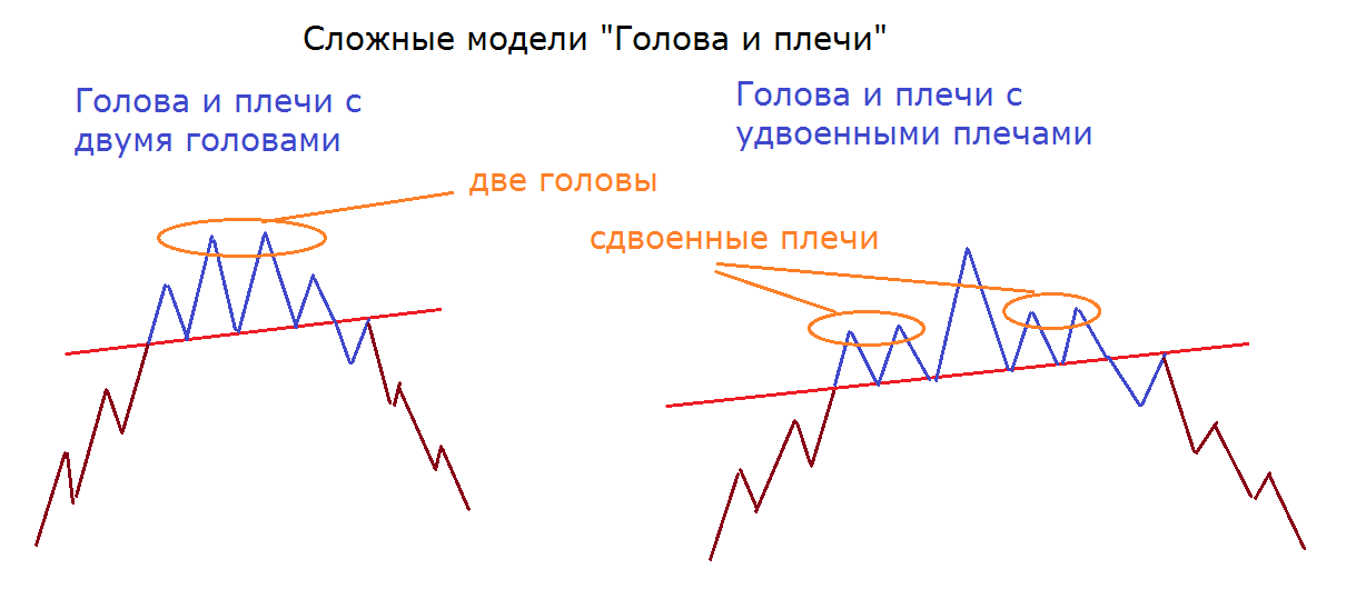 Также у ГиП может быть два левых и правых плеча. Это редкие фигуры на графиках, но анализируются они, как и обычная фигура ГиП – пробитие линии шеи и продажа на откате: