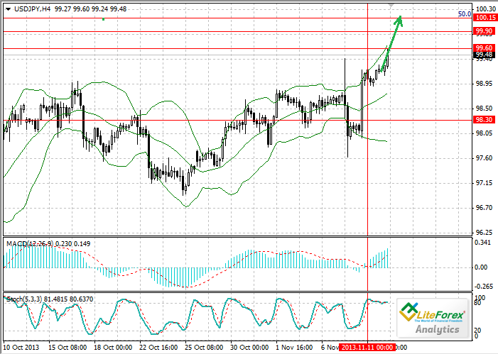 Уровни поддержки и сопротивления В ближайшее время пара, скорей всего, достигнет уровней 99.90 и 100.15 (линия 50% Фибоначчи). На четырёхчасовом графике технические индикаторы подтверждают возможность роста. Полосы Боллинджера направлены вверх. Гистограмма MACD находится в зоне перекупленности, объёмы её увеличиваются. Линии Стохастика чётких сигналов не дают.