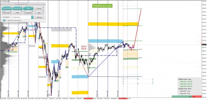 Среднесрочная тенденция: в лонг. Максимальное скопление объемов среднесрочной тенденции расположено в диапазоне, по котировкам 5020.00-5050.00. В настоящий момент по XAUUSD совершаются инвестиционные операции выше указанного диапазона, что говорит о силе покупателей.