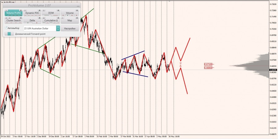 Среднесрочная тенденция: в шорт. Максимальное скопление объемов среднесрочной тенденции расположено в диапазоне по котировкам 0.66960-0.67060. В настоящий момент по паре совершаются инвестиционные операции ниже, указывая на силу продавцов.