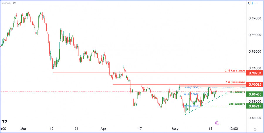 USD/CHF: возможен бычий отскок. Прогноз на 17 мая 2023ИнстаФорекс - Instaforex, 2 года назад На 4-часовом графике пара USD/CHF в настоящее время развивает бычий тренд. Цена находится выше значимой восходящей линии тренда, что указывает на возможное усиление бычьего импульса. Это также подтверждается тем фактом, что цена находится выше бычьего облака Ишимоку. Ожидается, что цена отскочит от 1-го уровня поддержки к 1-му уровню сопротивления. Первый уровень поддержки находится на отметке 0.8943 и совпадает с 38.2% уровнем коррекции Фибоначчи, который обычно служит критической точкой для ценовой реакции. Если цена продолжит снижение, она направится ко 2-му уровню поддержки 0.8871, который представляет собой уровень свинг-лоу. Если пара USD/CHF продолжит свой бычий рост, она столкнется с 1-м уровнем сопротивления 0.9002, который может стать значительным препятствием для быков. В случае бычьего прорыва этого уровня пара USD/CHF может попытаться достичь 2-го уровня сопротивления, расположенного на отметке 0.9070. Материал предоставлен компанией InstaForex - www.instaforex.com |
