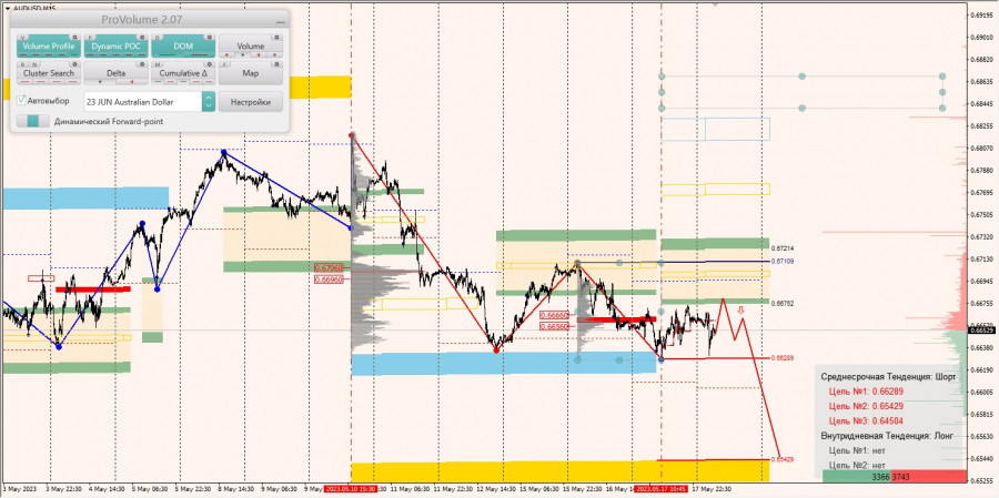 Среднесрочная тенденция: в шорт. Максимальное скопление объемов среднесрочной тенденции расположено в диапазоне по котировкам 0.66960-0.67060 и 0.66560-0.66660. В настоящий момент по паре совершаются инвестиционные операции ниже, указывая на силу продавцов.
