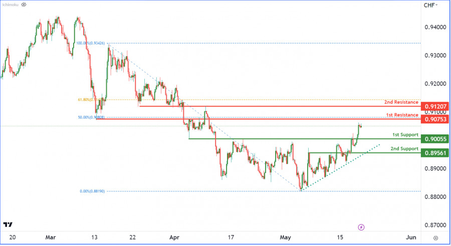 USD/CHF торгуется с повышением. Прогноз на 19 мая 2023ИнстаФорекс - Instaforex, 2 года назад На 4-часовом графике пара USD/CHF развивает бычий импульс, о чем свидетельствует расположение цены выше основной восходящей линии тренда. При этом возможно краткосрочное снижение к 1-му уровню поддержки 0.9005. Если цена прорвется ниже 1-го уровня поддержки, она направится к следующему уровню поддержки 0.8956, который может выступить в качестве дополнительной опоры. С другой стороны, уровень 0.9075 выступает в качестве сопротивления при откате и совпадает с 50% уровнем коррекции Фибоначчи. Если цена преодолеет этот уровень сопротивления, то следующий уровень сопротивления 0.9120, который соответствует 61.8% уровню коррекции Фибоначчи, станет серьезным препятствием. Материал предоставлен компанией InstaForex - www.instaforex.com |