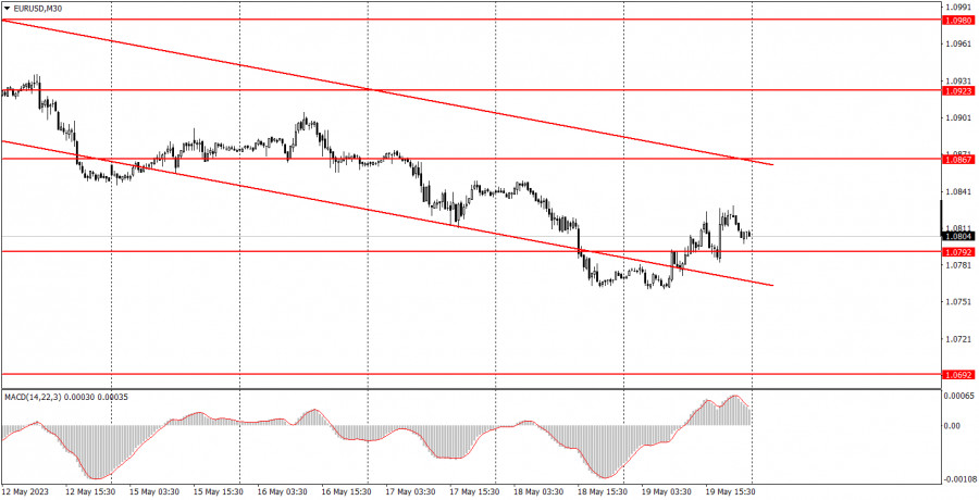 Фундаментальных событий в понедельник будет несколько больше. В разное время запланированы выступления Джеймса Булларда, Томаса Баркина и Рафаэля Бостика. Два последних выступления начнутся ближе к вечеру, поэтому начинающие трейдеры могут заранее покинуть рынок. Но мы в любом случае не ждем громких заявлений от Баркина и Бостика. Дело в том, что ФРС с высокой долей вероятности завершила цикл ужесточения. Некоторые его члены все еще поддерживают повышение ключевой ставки(например, Буллард), но пока что они находятся в меньшинстве. А сам Джеймс Буллард, который считается наиболее агрессивным «ястребом», не имеет права голоса в этом году. Поэтому его комментарии вряд ли повлияют на настроение рынка. Интересная информация от трех членов монетарного комитета может поступить, однако она, скорее всего, будет носить фоновый характер. ЕЦБ тоже близок к моменту завершения цикла ужесточения, рынок ждет еще максимум двух повышений ставки по 0,25%. И времени, чтобы отработать эти оставшиеся два повышения «авансом», у него было предостаточно. Поэтому ни фактор ставки ФРС, ни фактор ставки ЕЦБ, уже не могут оказывать сильного влияния на доллар или евровалюту. Общие выводы:В понедельник в календаре событий не содержится откровенно важных данных. Буллард может опять заявить о необходимости продолжить повышать ставку, чтобы не выпускать контроль над инфляцией, а два его коллеги могут быть более скромными в своих заявлениях. Если Бостик или Баркин поддержат инициативу Булларда повышать ставку, доллар может возобновить рост. Но мы считаем, что в понедельник более вероятен коррекционный сценарий. Основные правила торговой системы:1) Сила сигнала считается по времени, которое потребовалось на формирование сигнала(отскок или преодоление уровня). Чем меньше времени потребовалось, тем сильнее сигнал. 2) Если около какого-либо уровня были открыты две или больше сделки по ложным сигналам, то все последующие сигналы от этого уровня следует игнорировать. 3) Во флэте любая пара может формировать массу ложных сигналов или же не формировать их вовсе. Но в любом случае при первых признаках флэта лучше переставать торговать. 4) Торговые сделки открываются во временной период между началом европейской сессии и до середины американской, когда все сделки должны быть закрыты вручную. 5) На 30-минутном ТФ по сигналам от индикатора MACD можно торговать только при наличие хорошей волатильности и тренда, который подтверждается линией тренда или трендовым каналом. 6) Если два уровня расположены слишком близко друг к другу(от 5 до 15 пунктов), то следует рассматривать их, как область поддержки или сопротивления. Что на графиках:Ценовые уровни поддержки и сопротивления – уровни, которые являются целями при открытии покупок или продаж. Около них можно размещать уровни Take Profit. Красные линии – каналы или линии тренда, которые отображают текущую тенденцию и показывают в какую сторону предпочтительно сейчас торговать. Индикатор MACD(14,22,3) – гистограмма и сигнальная линия – вспомогательный индикатор, который также можно использовать в качестве источника сигналов. Важные выступления и отчеты(всегда содержаться в календаре новостей) могут очень сильно влиять на движение валютной пары. Поэтому во время их выхода торговать следует максимально осторожно или выходить из рынк
