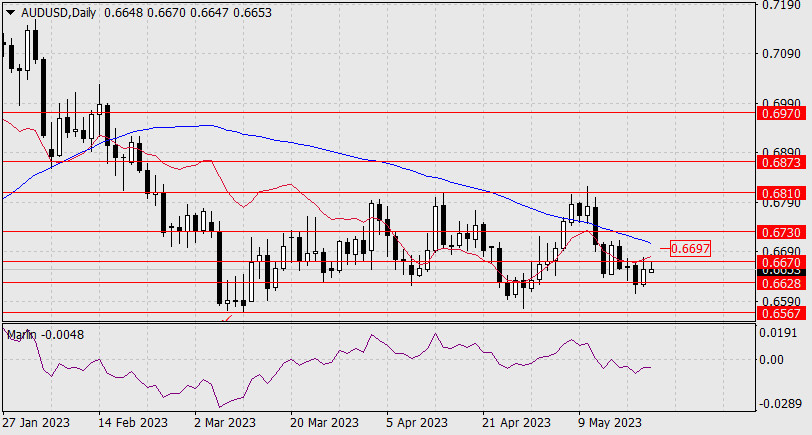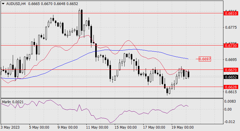 На четырёхчасовом графике цена показывает намерение развернуться от усиленного индикаторной линией баланса сопротивления 0.6670. Перешедший в пятницу осциллятор Марлин в положительную область разворачивается в обратную сторону. Теперь диапазон 0.6628/70 становится зоной свободного блуждания цены, так как для дальнейшего движения цене нужно преодолеть одну из границ данного диапазона.