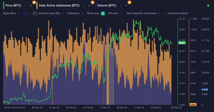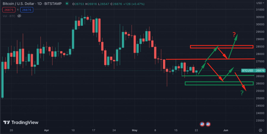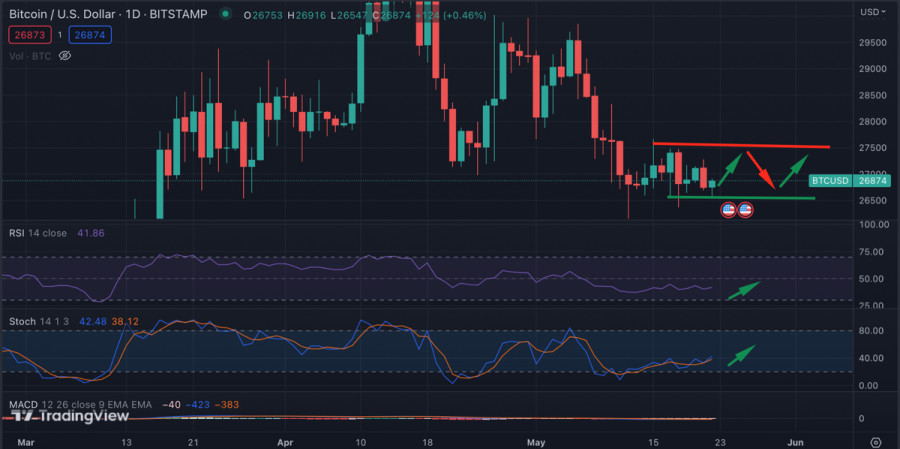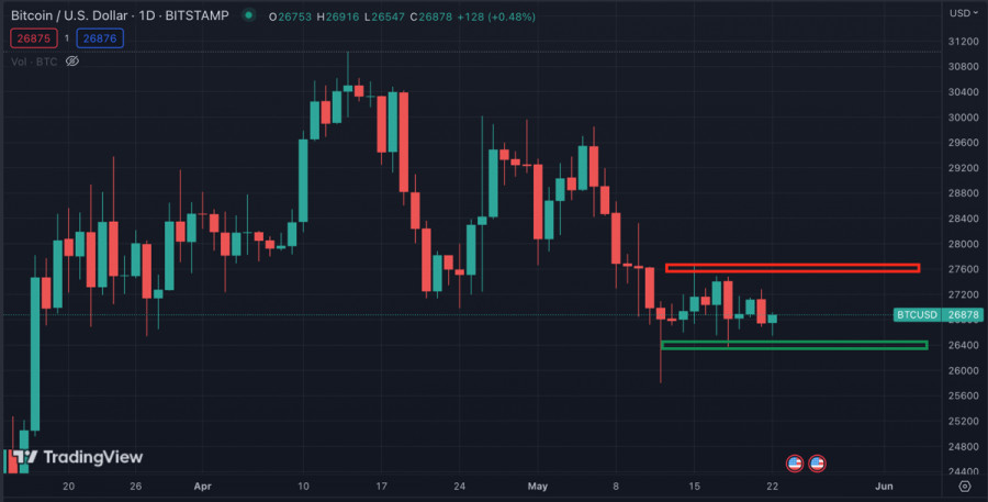 Консолидация Bitcoin продолжается: стоит ли ожидать изменения ситуацииИнстаФорекс - Instaforex, 2 года назад За последние две недели крипторынок стал приобретать очертания безлюдной пустыни. Цена Биткоина продолжает упорную консолидацию вблизи уровня $27k без претензий на выход за пределы диапазона $26,6k-$27,5k. Ситуация не изменилась даже после выступления членов ФРС в пятницу. Актив продолжает флэтовое движение при полном паритете быков и медведей. В результате мы не увидели мощных ценовых движений и всплесков волатильности. Ончейн-активность и объемы торгов на рынке Bitcoin также продолжают снижаться к локальным минимумам. Тезисы ФРСНа ситуацию не смогли повлиять выступления главных поставщиков волатильности на финансовые рынки – чиновников ФРС. Несмотря на то что во время выступления Пауэлла уровень активности вырос, кардинальным образом это на движение цены не повлияло. Более того, большое число трейдеров закрыло свои лимитные ордера из-за высокого уровня неопределенности в отношении движения цены BTC. В итоге цена криптовалюты осталась колебаться в диапазоне $26,6k-$27,5k. При этом Джером Пауэлл сделали важные заявления, которые можно считать позитивными. Чиновник отметил, что ключевой целью ФРС является снижение инфляции до 2%, которая составляет 4,9% по состоянию на конец мая. При этом Пауэлл признал, что ставка не будет повышаться из-за высокого кредитного напряжения, которое спровоцировало локальный кризис региональных банков США. Бычьи настроения на рынке BTCНесмотря на минимальное ценовое движение главной криптовалюты, настроения на рынке можно оценить как позитивные. На это указывает несколько важных ончейн-метрик. Как сообщают Santiment, число BTC в распоряжении "креветок" достигло абсолютного максимума на отметке 1,32 миллиона монет. Glassnode также отмечают, что объемы монет BTC в руках долгосрочных инвесторов достигло максимума на отметке 14,46 миллиона единиц. Это позитивные сигналы, указывающие на фундаментальную веру в актив. При этом наблюдаются большие оттоки монет BTC с криптобирж. Santiment сообщает, что на торговых площадках хранится около 5,7% от общего предложения BTC. Аналитики сообщают, что сразу после покупки инвесторы выводят активы для внебиржевого хранения, что также указывает на долгосрочные планы. В то же время это негативно сказывается на краткосрочных перспективах BTC, так как уровень волатильности и объемы торгов достигли минимумов за последние несколько лет. Также сообщается, что запасы BTC-майнеров за последние несколько дней снизились на 2000 BTC. Анализ BTC/USDВсе эти факторы указывают на долгосрочную ценность Биткоина, но показывают слабость покупателей в краткосрочной перспективе. Актив продолжает консолидироваться в районе $26,6k-$27,5k, и нет оснований полагать, что ситуация кардинально изменится в ближайшее время. Технические метрики также движутся в рамках узких диапазонов, что указывает на слабость импульса и его вероятную реализацию только в пределах диапазона колебаний. Однако при завершении консолидационного движения стоит ожидать выход BTC за пределы диапазона $26,6k-$27,5k. ИтогиПо состоянию на 22 мая Биткоин выглядит по-медвежьи, а, следовательно, шансов продолжить снижение у актива больше. Ключевыми уровнями для медведей являются $26,6k, где проходит важный уровень поддержки, и два мощных блока накопления в районе $26,1k и $26,2k. 