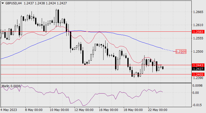 На четырёхчасовом графике цена удерживается под уровнем 1.2443 и под индикаторной линией баланса. Осциллятор Марлин с трудом удерживается на положительной территории. Вероятность дальнейшего снижения выше, чем продолжения роста. Одним из сопротивлений такого роста выступает линия Крузенштерна в районе 1.2500.