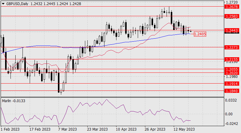Вчерашний диапазон фунта в 56 пунктов был ограничен снизу индикаторной линией Крузенштерна, сверху индикаторной линией баланса. Закрепление цены произошло под уровнем 1.2443. Осциллятор Марлин придерживается нейтральности на отрицательной территории.