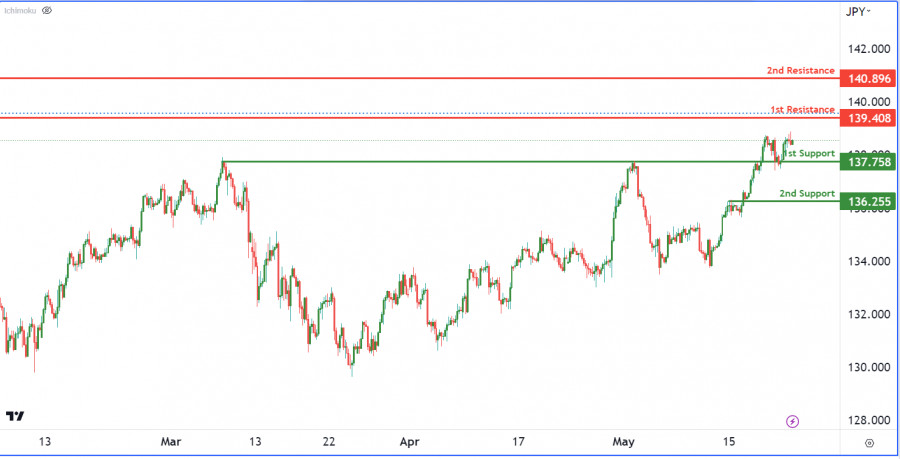 USD/JPY торгуется с повышением. Прогноз на 23 мая 2023ИнстаФорекс - Instaforex, 2 года назад На 4-часовом графике пара USD/JPY в настоящее время развивает бычий тренд. Ожидается, что цена продолжит рост по направлению к 1-му уровню сопротивления 139.40. Первый уровень поддержки находится на отметке 137.75 и может послужить барьером в случае снижения цены. Второй уровень поддержки расположен на отметке 136.25 и также может выступить в качестве опоры для цены в случае ее падения. Если восходящая тенденция продолжится, цена может столкнуться с 1-м уровнем сопротивления на отметке 139.40, которая исторически останавливала рост цен и вызывала развороты. Второй уровень сопротивления находится на отметке 140.89, при достижении которой цена может развернуться после краткосрочного отката. Материал предоставлен компанией InstaForex - www.instaforex.com |