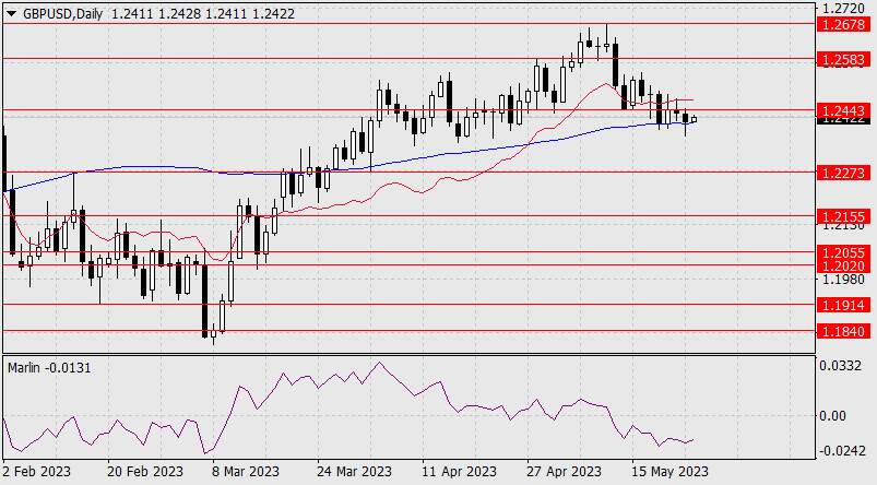 Британский фунт вчера изо всех сил старался преодолеть поддержку индикаторной линии Крузенштерна дневного масштаба, но помешали родственные валюты, не пожелавшие уступить доллару «раньше времени». В итоге цена продолжает консолидацию между линией Крузенштерна и уровнем 1.2443. Осциллятор Марлин текущую ситуацию оценивает как коррекционную, потому что разворачивается в рост.