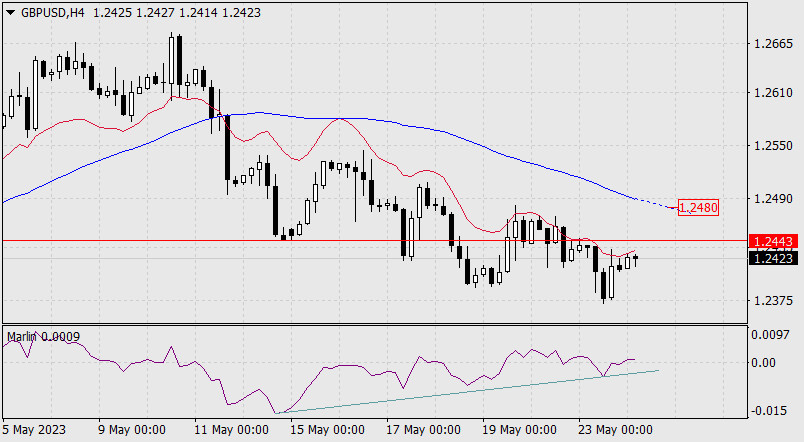 На графике Н4 сформирована двойная конвергенция цены с осциллятором. Марлин уже в положительной области. С преодолением ближайшего сопротивления 1.2443 откроется цель 1.2480 – индикаторная линия Крузенштерна. Для развития и усиления нисходящего движения должно произойти закрепление под минимумом вчерашнего дня 1.2372. Конвергенция в этом случае окажется сломленной (сигнальная линия уйдёт под образующую линию).