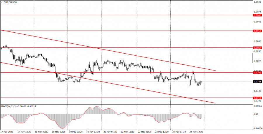 Фундаментальный событий в четверг тоже будет немного. В полдень состоится выступление вице-председателя ЕЦБ Луиса де Гиндоса. Однако за последние две недели неоднократно выступала Кристин Лагард и другие представители европейского регулятора, поэтому вряд ли риторика де Гиндоса будет кардинально отличаться от «общего курса». В Америке – выступление одного из членов монетарного комитета ФРС Коллинс. И здесь ситуация обстоит также, как и в Европе. Мы каждый день становимся свидетелями 2-3 выступлений чиновников из ФРС, поэтому четко понимаем, чего ожидать от регулятора на июньском заседании. С вероятностью 80-90% ставка останется без изменений. В Великобритании – выступление представителя Банка Англии Джонатана Хаскела. И тут тоже вряд ли стоит ожидать громких заявлений. Банк Англии повысит ставку еще 1-2 раза, так как вчерашний отчет по инфляции легко можно интерпретировать, как негативный. Мы считаем, что фундаментальный фон четверга тоже можно считать слабым. Общие выводы:В четверг в календаре содержится 6-7 интересных событий, но каждое из них имеет крайне низкие шансы на отработку рынком «здесь и сейчас». Скорее всего, волатильность сегодня будет низкая по обеим парам, нисходящая тенденция сохранится, характер движения(с частыми откатами и коррекциями наверх) останется прежним. Основные правила торговой системы:1) Сила сигнала считается по времени, которое потребовалось на формирование сигнала(отскок или преодоление уровня). Чем меньше времени потребовалось, тем сильнее сигнал. 2) Если около какого-либо уровня были открыты две или больше сделки по ложным сигналам, то все последующие сигналы от этого уровня следует игнорировать. 3) Во флэте любая пара может формировать массу ложных сигналов или же не формировать их вовсе. Но в любом случае при первых признаках флэта лучше переставать торговать. 4) Торговые сделки открываются во временной период между началом европейской сессии и до середины американской, когда все сделки должны быть закрыты вручную. 5) На 30-минутном ТФ по сигналам от индикатора MACD можно торговать только при наличие хорошей волатильности и тренда, который подтверждается линией тренда или трендовым каналом. 6) Если два уровня расположены слишком близко друг к другу(от 5 до 15 пунктов), то следует рассматривать их, как область поддержки или сопротивления. Что на графиках:Ценовые уровни поддержки и сопротивления – уровни, которые являются целями при открытии покупок или продаж. Около них можно размещать уровни Take Profit. Красные линии – каналы или линии тренда, которые отображают текущую тенденцию и показывают в какую сторону предпочтительно сейчас торговать. Индикатор MACD(14,22,3) – гистограмма и сигнальная линия – вспомогательный индикатор, который также можно использовать в качестве источника сигналов. Важные выступления и отчеты(всегда содержаться в календаре новостей) могут очень сильно влиять на движение валютной пары. Поэтому во время их выхода торговать следует максимально осторожно или выходить из рынка во избежание резкого разворота цены против предшествующего движения. Начинающим торговать на рынке форекс следует помнить, что каждая сделка не может быть прибыльной. Выработка четкой стратегии и мани-менеджмент являются залогом успеха в трейдинге на длительном промежутке времени. Материал предос