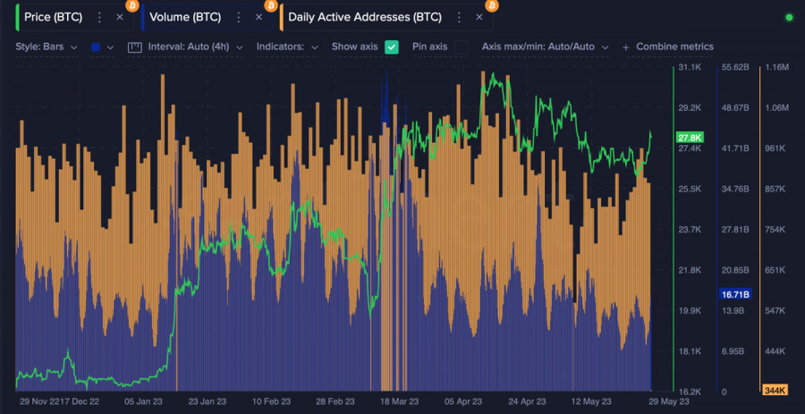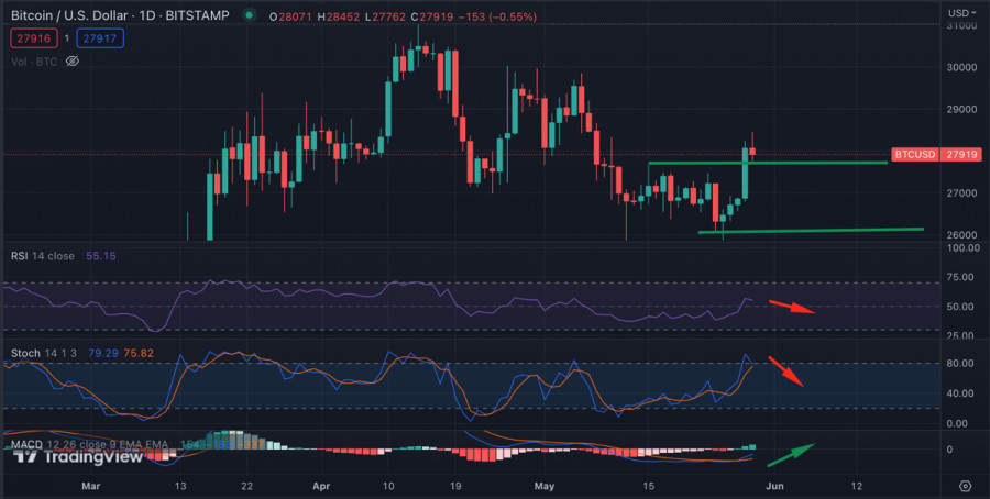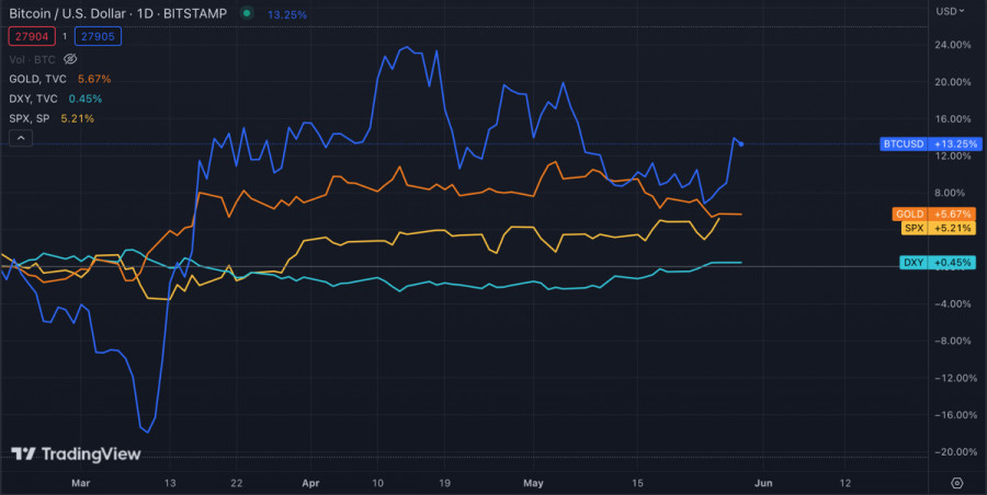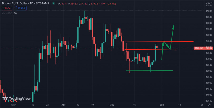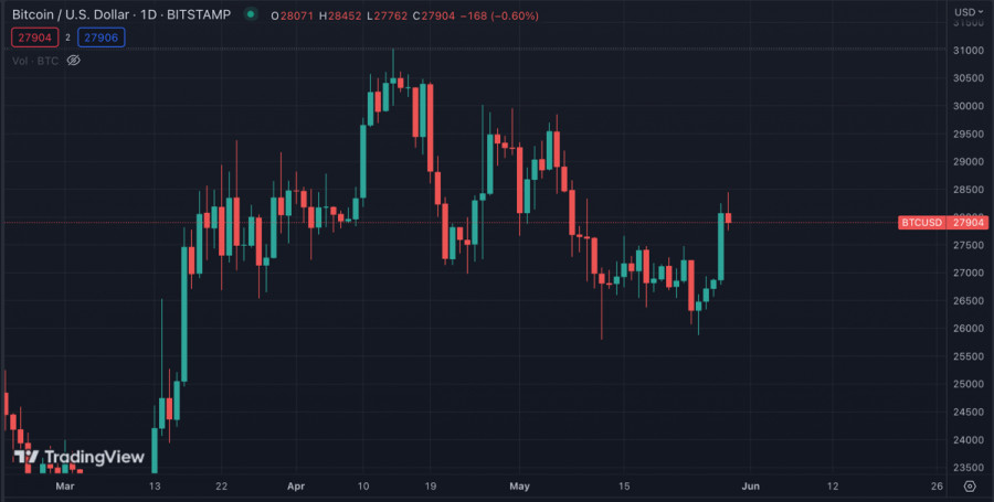 Биткоин ярко реагирует на разрешение ситуации с госдолгом СШАИнстаФорекс - Instaforex, 2 года назад Последние две недели торговая активность на финансовых рынках упала до минимумов. Рынок криптовалют не стал исключением, объемы торгов BTC упали до $9 миллиардов, что является минимумов за несколько лет. Параллельно с этим цена криптовалюты двигалась в рамках узкого диапазона $26,6k-$27,5k. На ситуацию слабо влияли выступления представителей ФРС и публикация макроэкономических данных. При этом постепенно возрастали медвежьи настроения, которые в конечном итоге привели к локальному снижению цены. Также этот процесс сопровождался фиксацией прибыли майнерами и розничными инвесторами. Госдолг СШАПричиной массового затишья на криптовалютном рынке стала высокая вероятность технического дефолта США. Учитывая потенциальные последствия такого события, инвестиционная активность снижалась, а высоким спросом начало пользоваться страхование гособлигаций от вероятного дефолта сроком на один год. В результате ситуация разрешилась и правительство США подписало документ о повышении суммы госдолга. При этом конкретные цифры в соглашении не указывались, что может означать отсутствие лимита госдолга Штатов на ближайшие два года. На фоне разрешения ситуации с госдолгом США мировые рынки, в том числе криптовалютный, отреагировали ростом. В моменте Биткоин достигал уровня $28,5k, что может указывать на дальнейшее увеличение объемов торгов криптовалютой. Однако в среднесрочной перспективе разрешение ситуации с госдолгом может сыграть против крипторынка. Ожидается, что после вступления в силу соглашения о снятии лимита госдолга, казначейство США будет пополнять свой баланс выпуском облигаций на $1 триллион. Это может существенно сократить ликвидность финансовых рынков и повысить процентные ставки, что соизмеримо с ястребиной политикой ФРС. Анализ BTCUSDПосле публикации информации о достижении договоренности, Биткоин совершил мощный восходящий рывок к уровню $28,5k. Актив совершил бычий выход за пределы диапазона $26,6k-$27,5k, который был основной областью колебаний актива на протяжении месяца. Впоследствии продавцам удалось отстоять уровень $28,5k, вследствие чего цена начала снижаться. Отметка $27,8k стала локальной зоной поддержки, где BTC закрепился после импульсного рывка. На данном этапе ключевой задачей криптовалюты станет удержание уровня $27,8k, так как в противном случае BTC вернется в привычный диапазон. На дневном таймфрейме мы видим, что бычий импульс выдохся и цена начала снижаться. RSI и стохастик также перешли к локальному снижению после достижения отметки 70. При этом MACD сформировал бычье пересечение и движется к нулевой отметке. Импульсное движение цены BTC спровоцировало увеличение объемов торгов и активности уникальных адресов. Также сообщается, что за сутки было ликвидировано коротких позиций на сумму более $104 миллиона. Биткоину удалось сохранить структуру восходящего тренда, но говорить о дальнейшем росте актива не стоит. ИтогиСреди краткосрочных целей Биткоина стоит выделить окончательное закрепление выше уровня $27,8k. Для возобновления восходящего движения криптовалюте необходимо закрепиться выше уровня $28,5k, который является плацдармом для повторного ретеста области $30k-$31k. Если все необходимые уровни будут достигнуты, то заседание 