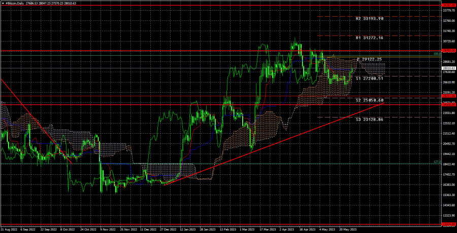 Биткоин готовится к возобновлению восходящего тренда?ИнстаФорекс - Instaforex, 2 года назад Биткоин на дневном таймфрейме показывает желание возобновить восходящий тренд. Пока что, конечно, это слишком громкий вывод, так как криптовалюта все еще находится ниже критической линии и внутри облака Ишимоку, однако рост последних дней может означать переход в наступление быков. На текущий момент лучше ориентировать в перспективах биткоина по 4-часовом ТФ, где имеется нисходящий канал, и он не нарушен. На дневном графике ситуация такова, что криптоактив может двинуться в любую сторону с равной степенью вероятности. Мы считаем, что нисходящая коррекция еще может возобновиться. Естественно, нельзя не обратить внимание на фундаментальный фон. Однако в последнее время важных новостей было катастрофически мало. По сути, все наиболее важные данные сводятся сейчас к ставкам ФРС и проблеме «потолка» госдолга в США. Со ставкой ФРС сейчас вся ясно. Если инфляция не начнет резко расти или не перестанет снижаться, то у регулятора просто нет никаких причин продолжать повышать ключевую ставку. В этом просто нет никакого смысла. В данное время рынок ожидает еще максимум одного, «форс-мажорного» ужесточения. И вряд ли биткоин начал снова расти на основании этого фактора. А вот решение проблемы с государственным долгом в Америке(которая, кстати, разрешена еще не до конца) могло спровоцировать новый рост первой криптовалюты в мире. Правда, достаточно сложно сказать, как именно связан биткоин с государственным долгом, но тот факт, что биткоин начал расти примерно в то же время, когда Джо Байден объявил о достижении принципиальной договоренности с республиканцами, говорит о том, что связь существует. Если это действительно так, то эта новость уже отработана. Дефолта в США не будет с вероятностью 99%. Остается лишь дождаться голосования в обоих палатах Конгресса. Таким образом, мы по-прежнему не видим веских причин у биткоина дорожать прямо сейчас. Общий фундаментальный фон остается благоприятным для него, но рынок уже заранее отработал все возможные «бычьи» факторы. Напомним, что ФРС еще даже не начала намекать на возможное смягчение монетарной политики, а халвинг запланирован лишь на следующий год. Мы пока не рассчитываем на новый взрывной рост биткоина, но следует внимательно следить за нисходящим каналом на 4-часовом ТФ. На 24-часовом таймфрейме биткоин несколько раз пытался преодолеть уровень 29 750$, но неудачно. В итоге криптовалюта начала нисходящую коррекцию. В ближайшее время мы ждем возобновления падения к уровню 25 211$, до которого остается пройти не очень много. Дальнейшее движение будет зависеть от преодоления или непреодоления этого уровня. Покупки можно будет рассматривать при формировании соответствующего сигнала. Например, отскока от 25 211$ или линии тренда. Также большое значение имеет канал на 4-часовом ТФ. Материал предоставлен компанией InstaForex - www.instaforex.com |