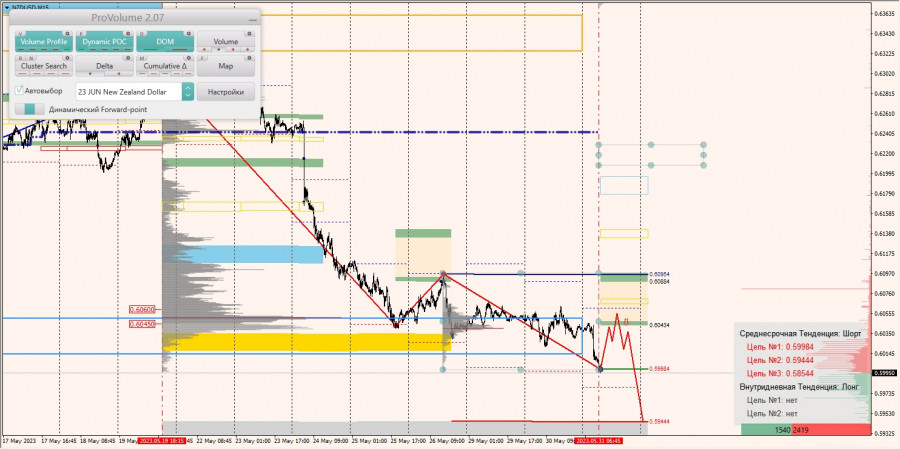 Среднесрочная тенденция: в шорт. Максимальное скопление объемов среднесрочной тенденции расположено в диапазоне по котировкам 0.60450-0.60600. В настоящий момент по паре совершаются инвестиционные операции ниже, указывая на силу продавцов.