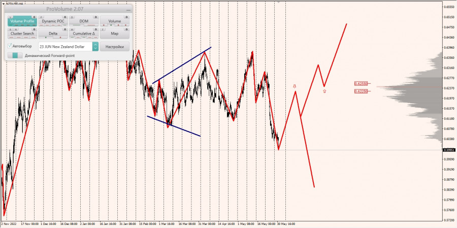 Долгосрочная тенденция: в шорт. Максимальное скопление объемов текущего контракта расположено в диапазоне по котировкам 0.62250-0.62550. В настоящий момент по паре совершаются инвестиционные операции ниже, указывая на силу продавцов.