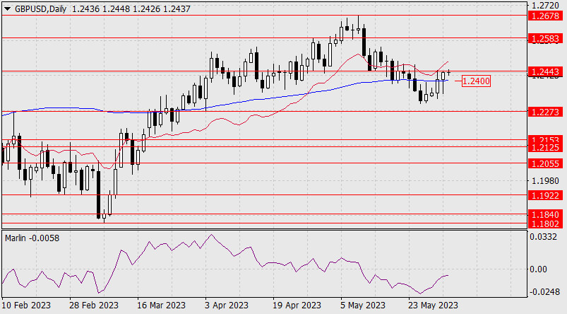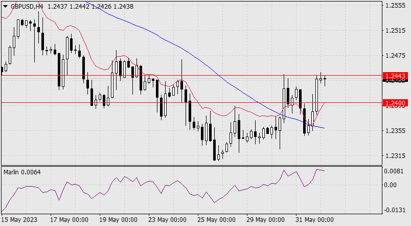 Возможно, уровень 1.2443 устоит (инвесторы с оптимизмом воспримут подписание президентом Байденом законопроекта о снятии потолка государственного долга на 2 года), тогда, после закрепления цены под линией Крузенштерна (ниже 1.2400), цена уверенно продолжит снижение, где первой целью выступает уровень 1.2273 (вершина 14 февраля).