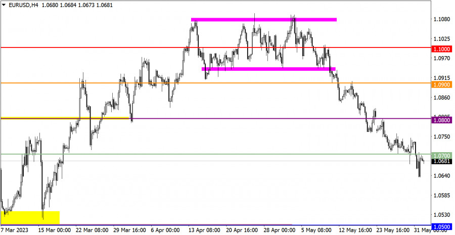 Сегодня макроэкономический календарь насыщен статистическими данными, ожидается публикация индексов деловой активности в ЕС, Великобритании и США. Однако, поскольку это итоговые показатели, реакция рынка маловероятна, если они не расходятся с предварительными оценками. Особое внимание трейдеров будет уделено данным по инфляции в ЕС, где прогнозируется замедление с 7,0% до 6,5%. Это может стать достаточным основанием для спекулянтов ожидать замедления темпов роста процентных ставок ЕЦБ, что, в свою очередь, может ослабить позиции евро. В течение американской сессии ожидается публикация отчета ADP о занятости в США, где прогнозируется рост на 170 тысяч человек, что является значительно меньшим показателем, чем в апреле. Отчет ADP часто рассматривается трейдерами как опережающий индикатор отчета Министерства труда США. В то же время будут опубликованы данные по заявкам на получение пособий по безработице в США, где ожидается рост объема. В соответствии с прогнозами статистика США может оказать негативное влияние на долларовые позиции, если она будет соответствовать ожиданиям. Временной таргетинг Индекс деловой активности в производственном секторе ЕС – 11:00 по МСК Индекс деловой активности в производственном секторе Великобритания – 11:30 по МСК Инфляция в ЕС – 12:00 по МСК Отчет ADP – 15:15 по МСК Заявки на пособие по безработице в США – 15:30 по МСК Индекс деловой активности в производственном секторе США – 16:45 по МСК Торговый план – EUR/USD 1 июняНа рынке по-прежнему преобладает нисходящий настрой от максимума среднесрочного тренда. В связи с этим если цена вернется к минимуму цикла, возможен новый виток снижения, несмотря на игнорирование технических сигналов о перепроданности евро. Важно учитывать, что, чем дольше сохраняется инерция на рынке, тем менее стабильными становятся спекулянты. В результате может произойти резкое сокращение объема коротких позиций, что может привести к развороту цены. Торговый план – GBP/USD 1 июняДля перехода из стадии отката в фазу восстановления курса фунта стерлингов относительно текущей коррекции необходимо, чтобы котировка удерживалась выше уровня 1.2500. Однако давление на курс евро ограничивает рост британской валюты из-за положительной корреляции между этими торговыми инструментами. В результате процесс восстановления может быть отложен, а котировка может вернуться к текущему минимуму.