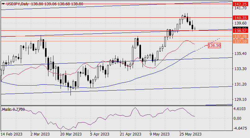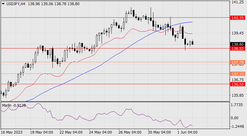 Прогноз по USD/JPY на 2 июня 2023 годаИнстаФорекс - Instaforex, 2 года назад USD/JPY Однако, данная цель может быть не достигнута, так как на этом пути находится два промежуточных уровня: 137.78 и 137.10. От любого из них может быть разворот вверх. Также и осциллятор Марлин ещё не вышел из зоны растущей тенденции. Показательным в такой двойственный момент будет именно сегодняшний день, так как вечером публикуются данные по занятости в США.