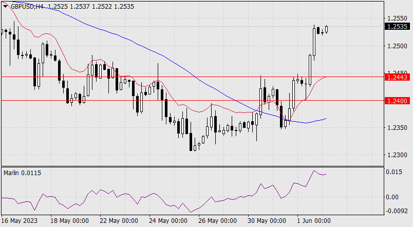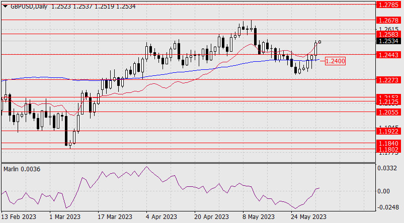 Прогноз по GBP/USD на 2 июня 2023 годаИнстаФорекс - Instaforex, 2 года назад GBP/USD Преодоление уровня позволит цене полностью откорректировать снижение от 10-го мая (1.2678), а это уже первый признак продолжения роста до следующего целевого уровня 1.2785. Сигнальная линия осциллятора Марлин вышла в положительную область, помогает цене.