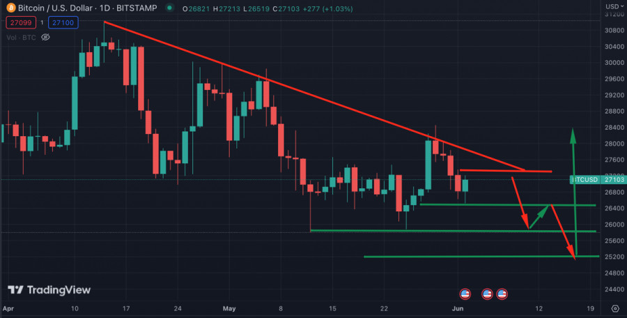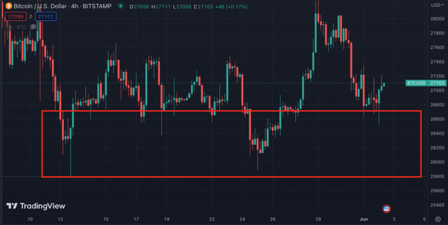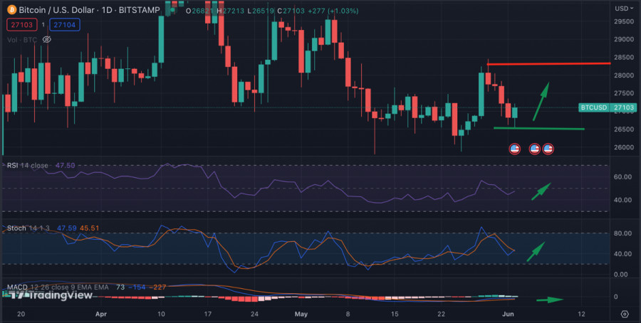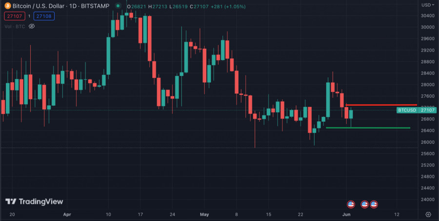 Bitcoin-инвесторы настроены по-медвежьи: стоит ли ждать обновления локального дна?ИнстаФорекс - Instaforex, 2 года назад Текущая неделя оказалась прорывной для Биткоина в плане импульсных ценовых движений. Двухнедельная консолидация актива завершилась резким выходом цены выше отметки $28k на повышающихся объемах. Впоследствии BTC имел все шансы закрепить успех и продолжить восходящее движение. Однако продавцам удалось перехватить инициативу, и цена BTC начала планомерно снижаться. По состоянию на 2 июня криптовалюта торгуется вблизи уровня $27k, и цена практически полностью отыграла недавний рост. Объемы торгов остаются на низком уровне, а настроения BTC-инвесторов указывают на вероятность дальнейшего снижения. На фундаментальном фоне без измененийНесмотря на растущие медвежьи настроения среди BTC-инвесторов, есть все основания полагать, что в среднесрочной перспективе криптовалюта возобновит рост. Во-первых, на это указывает успешное снятие ликвидности ниже уровня $26k, где в начале весны происходило массовое накопление среди долгосрочных инвесторов. Также сообщается, что соглашение об увеличении лимита госдолга США находится на финальной стадии, осталась лишь подпись президента. Помимо снижения напряжения на фондовом и других рынках, вступление этого документа в законную силу означает появление дополнительной ликвидности от казначейства США в размере $4 триллионов. Мировые финансовые рынки уверены, что, вне зависимости от дефляционного движения по итогам мая, ключевая ставка останется на текущем уровне. Лишь 36% инвесторов ожидают повышение показателя от ФРС в июне, что дает рынкам надежду на постепенное завершение ястребиной политики регулятора. Политика ФРС уже привела к тому, что в первом квартале 2023 региональные банки США столкнулись с крупнейшим оттоком средств с 1984. Согласно данным FDIC, клиенты вывели более $470 миллиардов из банков США. Параллельно с этим процессом капитализация Tether достигла $83,2 миллиардов, что является абсолютным рекордом. Анализ BTCUSDПозитивный фундаментальный фон пока не отражается на котировках Биткоина. Криптовалюта торгуется вблизи уровня $27k при объемах суточных торгов в районе $14 миллиардов. Покупателям удалось удержать уровень поддержки $26,5k, однако цена окончательно опустилась ниже $27k, что указывает на дальнейшее снижение. В техническом плане BTCUSD демонстрирует предпосылки к дальнейшему восстановительному движению. Стохастик сформировал бычье пересечение, а RSI приближается к отметке 50. MACD продолжает движение в боковом направлении, что указывает на очередное затишье на рынке. Bitcoin все еще удерживает уровень МА100, что потенциально дает активу шанс возобновить восходящее движение. Однако на данном этапе линия нисходящего тренда является непреодолимым препятствием для BTC. Объемы торгов уже более трех недель не превышали отметку в $25 миллиардов, однако ситуация может измениться после череды позитивных фундаментальных новостей. ИтогиМы приближаемся к завершающему этапу скучного и малоинформативного флэтового движения Биткоина. Торговая активность на рынке обновила все допустимые минимумы, однако в ближайшее время ситуация может измениться. Несмотря на фундаментальный позитив, стоит ожидать очередную попытку медведей достичь уровня $25k. В среднесрочной перспективе BTC, как и весь крипторынок, в
