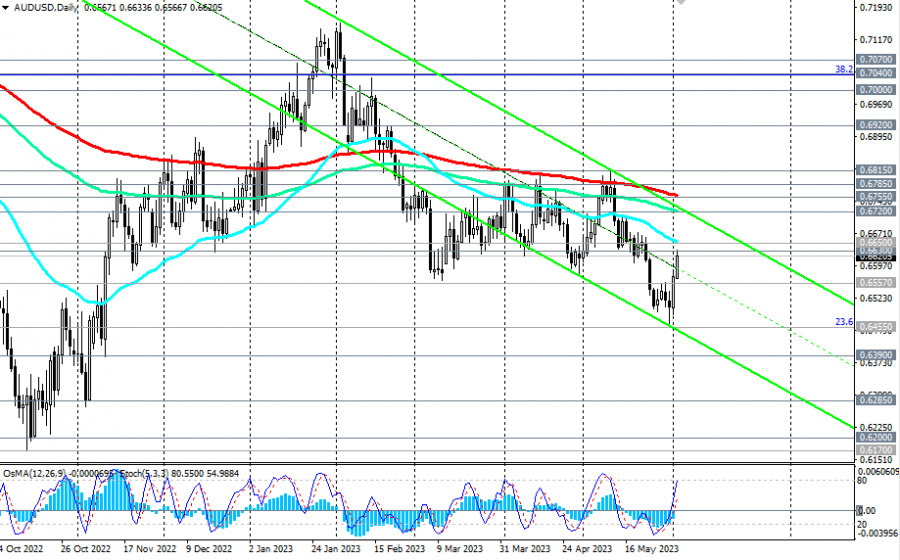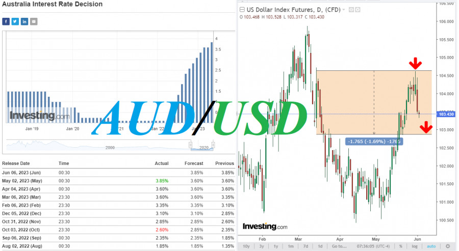 AUD/USD: накануне заседания РБАИнстаФорекс - Instaforex, 2 года назад Как мы отметили в нашем сегодняшнем обзоре «Доллар: накануне NFP», на сегодня намечена публикация отчета Минтруда США с данными за май (запланирована на 12:30 GMT). В это время ожидается резкий рост волатильности на финансовом рынке, и прежде всего в котировках доллара. Начало же следующей недели привлечет внимание прежде всего инвесторов, следящих за котировками австралийского доллара и пары AUD/USD. В начале азиатской торговой сессии понедельника будут опубликованы ряд важных макроданных по Австралии, а во вторник руководители Резервного банка Австралии проведут очередное заседание. Как известно, на завершившемся в мае заседании они приняли решение повысить ключевую процентную ставку на 0,25% (до 3,85% с 3,60% ранее), удивив своим неожиданным решением участников рынка. На предыдущих 2-х заседаниях руководители РБА не вносили изменений в параметры текущей кредитно-денежной политики. Руководителям РБА все же пришлось вновь прибегнуть к повышению процентной ставки, а в сопроводительном заявлении по итогам заседания говорилось, что «может потребоваться некоторое дальнейшее ужесточение денежно-кредитной политики». По их мнению, «инфляция на уровне 7% все еще слишком высока, и пройдет еще некоторое время, прежде чем она вернется в целевой диапазон», хотя «дальнейшее ужесточение будет зависеть от того, как будут развиваться экономика и инфляция». Экономисты ожидают, что на июньском заседании процентная ставка РБА останется на прежнем уровне 3,85%. Ужесточение условий кредитования бизнеса и повышение стоимости заимствований все же имеет негативные последствия для национальной экономики. Американская экономика, например, пока что справляется с этим, судя по сильному рынку труда и росту американских фондовых индексов. Справится ли с ужесточением монетарной политики национального ЦБ австралийская экономика, учитывая ее гораздо меньший размер и во многом пока еще сохраняющей признаки сырьевой? В РБА считают, согласно заявлению по итогам майского заседания, что «существенным источником неопределенности остаются перспективы потребления домашних хозяйств». Также ожидается, что «инфляция составит 4,5% в 2023 году и 3% в середине 2025 года», продолжая медленно слабеть. Другими словами, руководители РБА будут очень серьёзно относиться к целесообразности дальнейшего ужесточения политики, периодически делая паузу в цикле этого ужесточения. Так или иначе, рынок отреагировал на итоги майского заседания РБА резким укреплением австралийского доллара и рывком пары AUD/USD «на север». Тем не менее рост пары был остановлен в зоне ключевого уровня сопротивления 0.6785 (ЕМА200 на дневном графике на тот момент) и отметки 0.6800. Однако в дальнейшем пара AUD/USD вновь снизилась, прежде всего за счет укрепления американского доллара, почти достигнув в конце прошлого месяца важного уровня поддержки 0.6455 (более подробно см. в «AUD/USD: сценарии динамики на 02.06.2023»). И наоборот, опять же за счет резкого ослабления USD вчера и сегодня пара AUD/USD достаточно сильно скорректировалась вверх, но остановив свой бычий порыв на важном краткосрочном уровне сопротивления 0.6630. Теперь многое в динамике AUD/USD будет зависеть от сегодняшней публикации отчета Минтруда США (в 12:30 GMT) и итогов заседания РБА. Напомним, что его решение по процент
