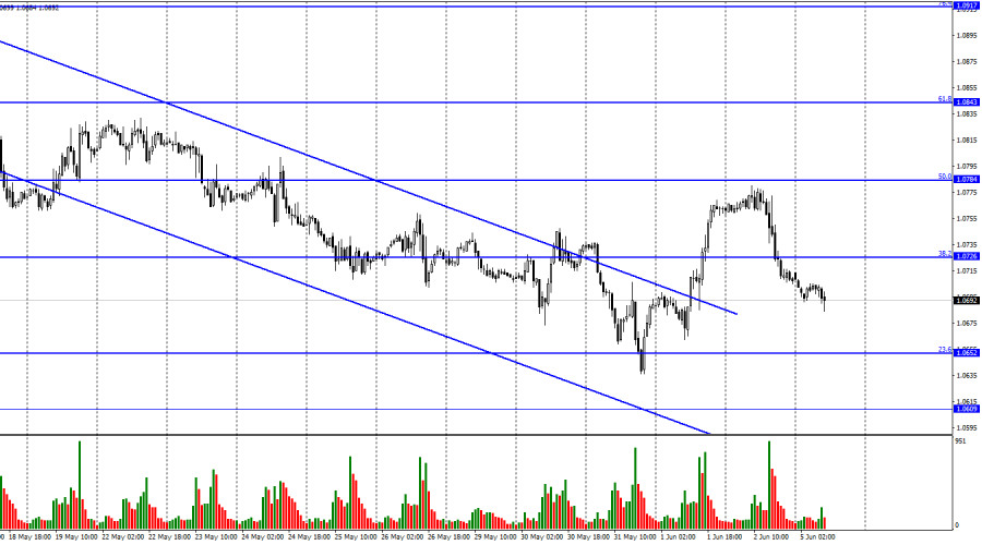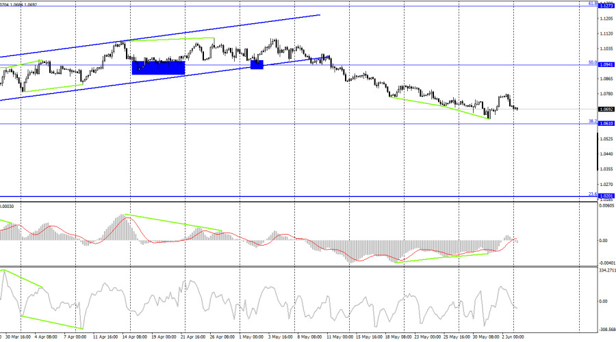EUR/USD. 5 июня. Быки воспряли духом после отчета по пэйроллам СШАИнстаФорекс - Instaforex, 2 года назад Добрый день, уважаемые трейдеры! Пара EUR/USD в пятницу выполнила разворот в пользу американской валюты и начала новое падение с закрытием под уровнем коррекции 38,2% – 1,0726. Таким образом, общее падение пары может быть продолжиться в направлении следующего уровня Фибо 23,6% – 1,0652. Отбой котировок от уровня 1,0652 сработает в пользу европейца и некоторого роста, а закрытие под ним – повысит вероятность продолжения падения в направлении уровня 1,0609. В пятницу трейдеры пристально следили за американскими отчетами. В течение всей прошлой недели было много важных событий, но данные по рынку труда и безработице всегда занимали особое место в сердцах трейдеров. Забегая немного вперед, скажу, что статистика поддержала медведей, но два наиболее важных отчета показали неодинаковую тенденцию. Уровень безработицы по итогам мая вырос с 3,4% до 3,7%, хотя трейдеры ожидали рост до 3,5%. А Nonfarm Payrolls в мае показал результат +339К при ожиданиях +180К. Таким образом, уровень безработицы оказался хуже, а пэйроллы – лучше. Трейдеры решили, что отчет по пэйроллам важнее (и я с ними полностью согласен), поэтому доллар вновь вырос в цене. На мой взгляд, американская валюта должна продолжать рост, так как все последние статистические данные указывают на хорошее состояние американской экономики. ФРС продолжает занимать «ястребиную» позицию и даже после повышения процентной ставки до 5,25% экономика продолжает показывать рост, безработица – низкая, а рынок труда почти каждый месяц создает больше рабочих мест, чем от него ждет рынок. Я считаю, что это убедительные основания для дальнейшего роста доллара, который за последний год очень сильно потерял в цене. На старших графиках прослеживается коррекционная возможность к уровню 1,03. На 4-часовом графике пара выполнила разворот в пользу европейца, но рост продолжался недолго. В данное время падение котировок может быть возобновлено в направлении коррекционного уровня 38,2% – 1,0610. Отбой курса пары от этого уровня вновь позволит рассчитывать трейдерам на небольшой рост в направлении уровня Фибо 50,0% – 1,0941. Закрепление котировок под уровнем 1,0610 повысит шансы на продолжение падения в направлении уровня Фибо 23,6% – 1,0201. Отчет Commitments of Traders (COT):