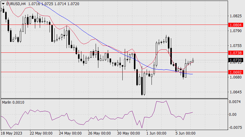 На четырёхчасовом графике индикаторная линия Крузенштерна постепенно залегает в горизонт, сигнальная линия Марлина пытается слиться с нулевой нейтральной линией. Тенденция нейтральная и, похоже, останется таковой ещё неделю, до заседания ФРС. Впрочем, 13-го числа ещё выйдут ИПЦ, которые могут запутать участников рынка ещё больше.