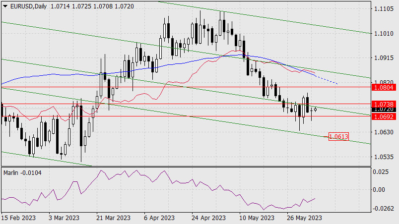 Мы допускаем, что при выходе вверх может быть отработано сопротивление 1.0804. Уровень даже может быть преодолён с отработкой линии Крузенштерна, и тогда это станет глубокой коррекцией от снижения с 4 мая. Рост цены до 1.0804 составляет примерно 38,2% от понижающейся ветки с 4 мая. Но пока не преодолён уровень 1.0738 мы придерживаемся понижающего сценария, при котором будет отработана цель 1.0613. Осциллятор Марлин уже достаточно подрос (снял отрицательное напряжение) и теперь может развернуться в новую волну снижения.