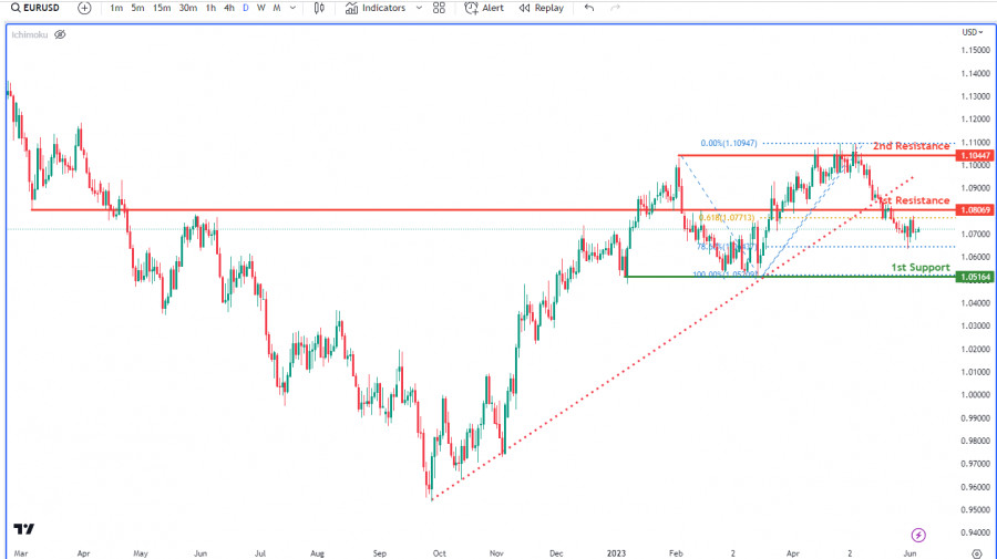 На дневном графике пара EUR/USD в настоящее время развивает слабый бычий импульс. Существует вероятность того, что цена продолжит свое восходящее движение, нацелившись на 1-й уровень сопротивления. Первый уровень сопротивления расположен на отметке 1.08069 и является значимым уровнем, поскольку совпадает с ключевыми уровнями Фибоначчи, соответственно, может вызвать рыночную активность и потенциальный разворот тренда. С другой стороны, 1-й уровень поддержки находится на отметке 1.05164 и представляет собой уровень свинг-лоу, потенциально выступая в качестве дна. Этот уровень также определен как поддержка при откате, поэтому может послужить существенной опорой при нисходящем импульсе, привлекая на рынок покупателей.