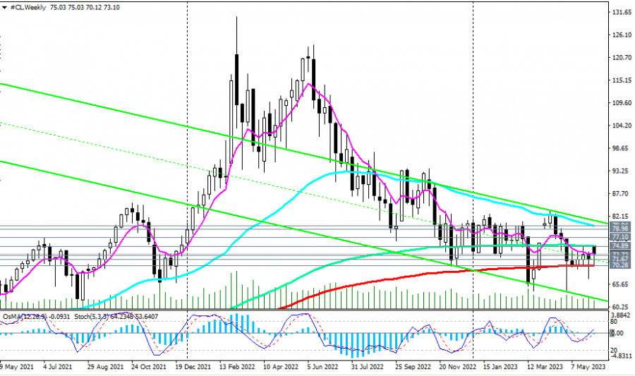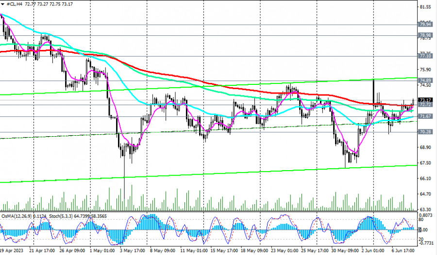 WTI: сценарии динамики на 08.06.2023ИнстаФорекс - Instaforex, 2 года назад Как мы отметили в нашем сегодняшнем «Фундаментальном анализе», сокращение добычи со стороны ОПЕК+ приведет к росту цен на нефть, возможно, к ранее достигнутым уровням в 90-100 долларов за баррель, хотя многое также будет зависеть от состояния мировой экономики, рынков нефти США и Китая, а также динамики доллара. С технической же точки зрения цена нефти марки WTI (#CL, CFD на фьючерс на нефть марки WTI на бирже NYMEX и в торговом терминале МТ4) пытается развить восходящую краткосрочную динамику выше уровня сопротивления 72.72 (ЕМА200 на 4-часовом графике), чтобы затем прорваться в зону ключевых уровней сопротивления 77.10 (ЕМА144 на дневном графике), 78.98 (ЕМА200 на дневном графике), 79.94 (ЕМА50 и верхняя граница нисходящего канала на недельном графике), отделяющих среднесрочный бычий рынок от медвежьего. Сигналом для открытия длинных позиций на сегодня может стать пробой уровня сопротивления 73.41 (ЕМА50 на дневном графике) со стопом ниже важного краткосрочного уровня поддержки 71.67. Срабатывание данного стоп-лосса, в свою очередь, может активировать альтернативный сценарий на возобновление снижение цены. В этом случае подтвержденный пробой ключевого уровня поддержки 70.28 (ЕМА200 на недельном графике) откроет цене дорогу для более значительного снижения в сторону нижней границы нисходящего канала на недельном графике и к отметке 61.00, повысив таким образом риски слома долгосрочного и глобального бычьего тренда WTI. Уровни поддержки: 71.67, 70.28, 67.50, 64.00, 62.00, 61.00 Уровни сопротивления: 72.72, 73.41, 74.89, 77.10, 78.98, 79.94, 80.00 *) копирование сигналов в Instaforex - **) ПАММ-система в Instaforex - ***) открыть торговый счет в Instaforex -