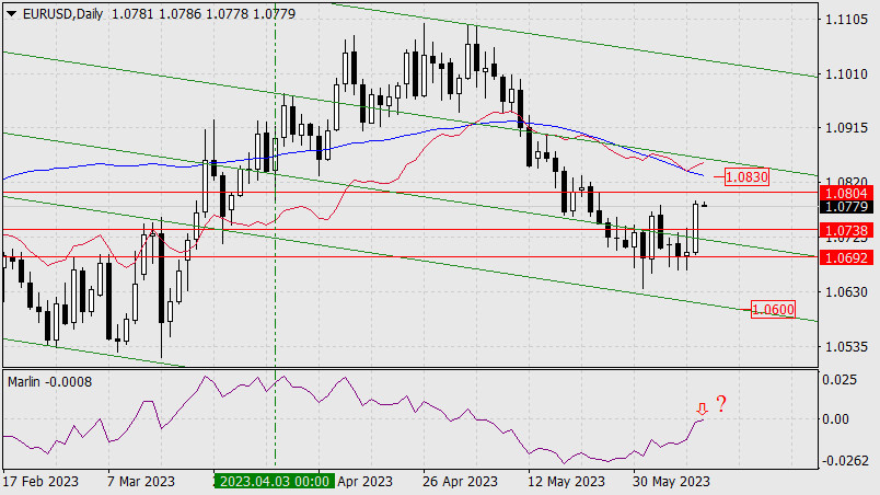 На графике четырёхчасового масштаба цена растёт над обеими индикаторными линиями, но осциллятор Марлин рост, похоже, завершил. Поэтому отработка целевого уровня 1.0804 ещё возможна, но дальнейший рост будет выглядеть не логичным, чисто спекулятивным.