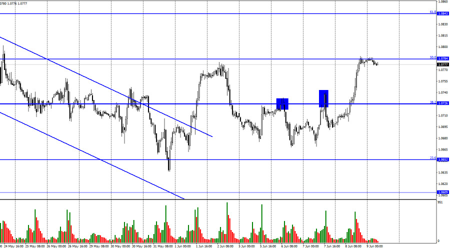 EUR/USD. 9 июня. ВВП Евросоюза не остановил трейдеров-быковИнстаФорекс - Instaforex, 2 года назад Добрый день, уважаемые трейдеры! Пара EUR/USD в четверг выполнила разворот в пользу европейской валюты и рост к коррекционному уровню 50,0% – 1,0784. Отбой курса пары от этого уровня сработает в пользу американской валюты и некоторого падения в направлении уровня Фибо 38,2% – 1,0726. Закрытие котировок над уровнем 1,0784 повысит вероятность продолжения роста в направлении следующего уровня Фибо 61,8% – 1,0843. Вчерашний день стал полной неожиданностью для многих трейдеров. Европейская валюта начала свой рост еще ночью и сохраняла этот темп и направление весь день, показав рост почти на 100 пипсов. Что интересно, информационный фон практически отсутствовал в четверг, а те отчеты, которые вышли, не поддерживали евровалюту. ВВП в первом квартале ЕС в окончательной оценке составил -0,1% кв/кв и 1,0% г/г. Трейдеры ожидали увидеть 0% и 1,2% соответственно. Так как ВВП – это показатель, который напрямую отражает состояние экономики, то в борьбу могли бы включиться медведи. Но это не произошло. Рынок просто проигнорировал указанный отчет. В Америке вышел отчет по первичным заявкам на пособия по безработице, который на 30 тысяч превысил ожидания трейдеров. Это негативный факт для доллара США, но отчет по заявкам вышел после обеда, а доллар падал еще с ночи. Возможно, во второй половине четверга этот отчет и поддержал евровалюту. Но как объяснить ее рост утром и днем? На мой взгляд, сейчас трейдеры торгуют вне зависимости от информационного фона. На всей текущей неделе экономических отчетов было очень мало. В некоторые дни движения пары были соответствующими, но вчера – нет. Уже на следующей неделе состоится заседание FOMC, а также выйдет отчет по американской инфляции. Эти два события должны будут помочь рынку более четко определиться с дальнейшим направлением и приоритетами. На 4-часовом графике пара выполнила разворот в пользу европейца и может продолжить процесс роста в направлении уровня Фибо 50,0% – 1,0941. Назревающих дивергенций сегодня не наблюдается ни у одного индикатора. До уровня 1,0941 достаточно далеко, поэтому потенциальные сигналы на продажу следует отслеживать на часовом графике. Отчет Commitments of Traders (COT):