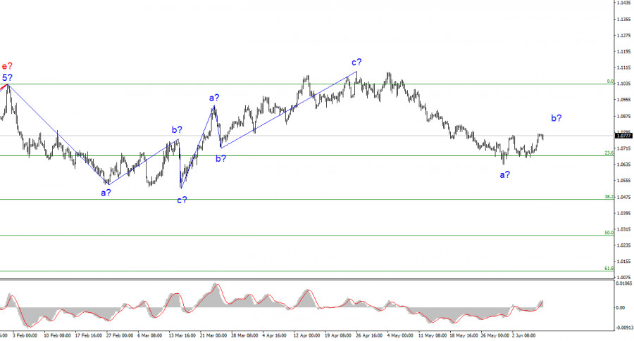 Анализ EUR/USD. 9 июня. Против евро играет слишком много факторов.ИнстаФорекс - Instaforex, 2 года назад Волновая разметка 4-часового графика для инструмента Евро/Доллар продолжает оставаться не совсем стандартной, но при этом вполне понятной. Продолжается отход котировок от достигнутых ранее максимумов, поэтому трех волновую повышательную структуру можно считать завершенной. Весь восходящий участок тренда, берущий свое начало еще 15 марта, может еще теоретически принять более сложную структуру, но в данное время я рассчитываю на построение понижательного участка тренда, который, вероятнее всего, тоже получится трех волновым. В течение последнего времени я регулярно говорил, что жду инструмент около 5-й фигуры, откуда в свое время и началось построение повышательной трехволновки. Верхняя точка последнего участка тренда лишь на пару десятков пунктов оказалась выше пика предыдущего повышательного участка. С декабря прошлого года движение инструмента можно считать горизонтальным и я думаю, что такой характер передвижения сохранится. Предполагаемая волна b, которая могла начать свое построение 31 мая, на данный момент имеет очень неубедительный вид, но все же имеется повышение котировок, поэтому со временем она может стать такой, как следует. Коррекционная волна b уже готова завершить построение.Курс инструмента Евро/Доллар в пятницу повысился еще на несколько десятков пунктов, а днем ранее – на целых 120. Заход котировок инструмента за предыдущий пик означает, что предполагаемая волна b приняла трех волновой вид, а значит может завершить свое построение в любой момент. Если это действительно так, то уже на следующей неделе стоит ожидать разворота и начала построения третьей нисходящей волны в составе текущего понижательного участка тренда. Напомню, что именно такого сценария я и ожидаю в данное время. Вчера при ближайшем рассмотрении стало ясно, почему спрос на валюту США сильно снизился в течение дня. Вчера я говорил, что основной причиной является волновая разметка, предусматривающая построение повышательной волны. И от своих слов я не отказываюсь. Добавлю лишь то, что отчет по первичным заявкам на пособия по безработице в США впервые за долгое время оказался за пределами прогнозного диапазона и показал более высокий прирост. Всё это признаки ослабления рынка труда США, что и вызвало снижение доллара. Однако у евровалюты перспективы роста остается негативными. Инфляция в Евросоюзе продолжает ослабевать, экономический рост в первом квартале – отрицательный. Это наводит меня на мысль, что у ЕЦБ есть определенный план по ставкам(который, конечно, не озвучивается в открытую), и превышен этот план не будет. Рынок уже сейчас заложил в цены два повышения ставки на 25 базисных пунктов, и большего от ЕЦБ не ждет. Исходя из всего вышесказанного, я делаю вывод: смягчать свой подход ЕЦБ не будет, но и ужесточать тоже не будет. А повышение на 50 базисных пунктов этим летом рынок уже учел. Общие выводы.Исходя из проведенного анализа, я делаю вывод, что продолжается построение нового понижательного участка тренда. Поэтому сейчас можно советовать продажи, а инструмент имеет довольно большой простор для снижения. Я по-прежнему считаю цели в районе 1,0500-1,0600 вполне реальными, и с этими целями я и советую продажи инструмента. От отметки 1,0678 началось пос