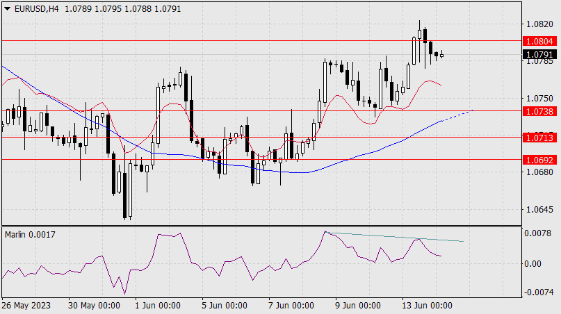 На графике четырёхчасового масштаба цена консолидируется под уровнем 1.0804. Осциллятор Марлин находится под давлением (дивергенция), но ещё находится в положительной области. Какое краткосрочное направление изберёт рынок, станет известно лишь сегодня поздно вечером.