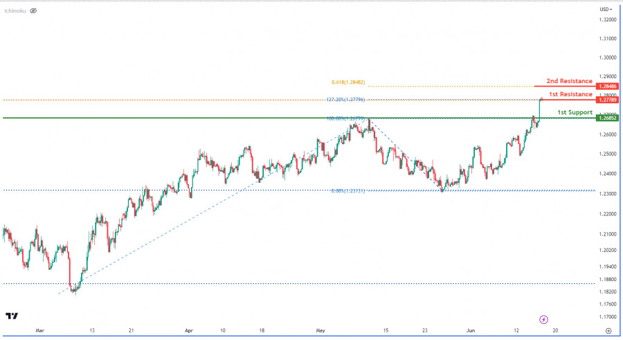 На графике валютной пары GBP/USD мы наблюдаем медвежий импульс, что указывает на наличие нисходящего тренда. Участникам рынка следует учитывать возможность снижения к первому уровню сопротивления 1,3778 и последующего падения до первого уровня поддержки 1,2685. Эта отметка важна, так как от нее может произойти откат, тем самым привлекая потенциальных покупателей и обеспечивая стабильность цены. И наоборот, первый уровень сопротивления 1,3778 является локальным максимумом и значительным ценовым барьером, который потенциально препятствуя восходящему движению. Кроме того, наличие проекции Фибоначчи 61,80% придает значимость второму уровню сопротивления 1,2848, выделяя его как потенциальную область сопротивления.