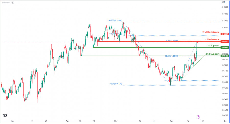 EUR/USD, H4 | Возможность падения цены к 1-му уровню поддержкиИнстаФорекс - Instaforex, 2 года назад График валютной пары EUR/USD указывает на наличие бычьего импульса. Котировка располагается выше важной линии восходящего тренда, что является признаком возможного дальнейшего восходящего движения. В краткосрочной перспективе цена может упасть до первого уровня поддержки 1,0905, прежде чем отскочить к первому уровню сопротивления 1,0949. Значительные уровни поддержки располагаются на отметках 1,0905 и 1,0846, от которых возможен откат. Эти уровни также совпадают с коррекцией Фибоначчи 38,20%. Первый уровень сопротивления 1,0949 действует как сопротивление с перекрытием, в то время как второй уровень сопротивление 1,1002 является локальным максимумом и совпадает с коррекцией Фибоначчи 78,60%. |