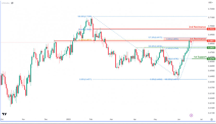 AUD/USD, D1: возможно снижение к уровню поддержкиИнстаФорекс - Instaforex, 2 года назад На графике пары AUD/USD преобладает медвежий импульс, что указывает на нисходящий тренд. Потенциальная медвежья реакция на первом уровне сопротивления на 0,6881 может привести к снижению к первому уровню поддержки на 0,6679. Первая поддержка на уровне 0,6679 совпадает с уровнем коррекции Фибоначчи 50%, а промежуточная поддержка на уровне 0,6802 совпадает с уровнем коррекции Фибоначчи 23,60%. Первое сопротивление на уровне 0,6881 действует как сопротивление перекрытия и совпадает с уровнями коррекции Фибоначчи 127,20% и 61,80%. Второе сопротивление на уровне 0,7016 выступает в качестве локального максимума, совпадая с уровнем коррекции Фибоначчи 78,60%. Материал предоставлен компанией InstaForex - www.instaforex.com |