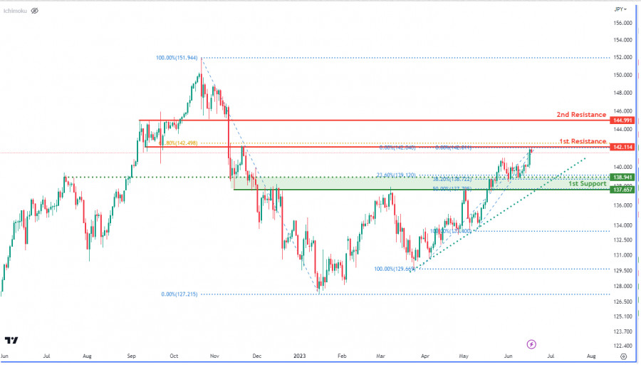 USD/JPY, D1: возможен отскок от 1-го уровня сопротивленияИнстаФорекс - Instaforex, 2 года назад График USD/JPY указывает на медвежий импульс, предполагающий нисходящий тренд. Тем не менее, цена все еще находится выше основной восходящей линии тренда, что указывает на потенциальный бычий импульс. Существует вероятность снижения от первого уровня сопротивления на 142,11, что приведет к дальнейшему падению к первому уровню поддержки на 137,65. Промежуточная поддержка на уровне 138,94 совпадает с уровнем коррекции Фибоначчи 38,20%, что еще больше подчеркивает ее важность для потенциальной стабилизации цен. С другой стороны, первый уровень сопротивления на 142,11 действует как сопротивление перекрытия и соотносится с уровнем коррекции Фибоначчи 61,80%, выступая в качестве сильного барьера, ограничивающего рост цены. Второй уровень сопротивления на отметке 144,99 совпадает с уровнями коррекции Фибоначчи 50% и 38,20%, что усиливает его роль в качестве важного сопротивления. Материал предоставлен компанией InstaForex - www.instaforex.com |