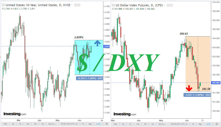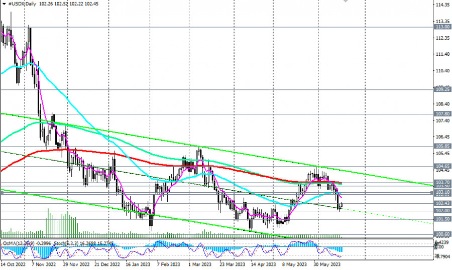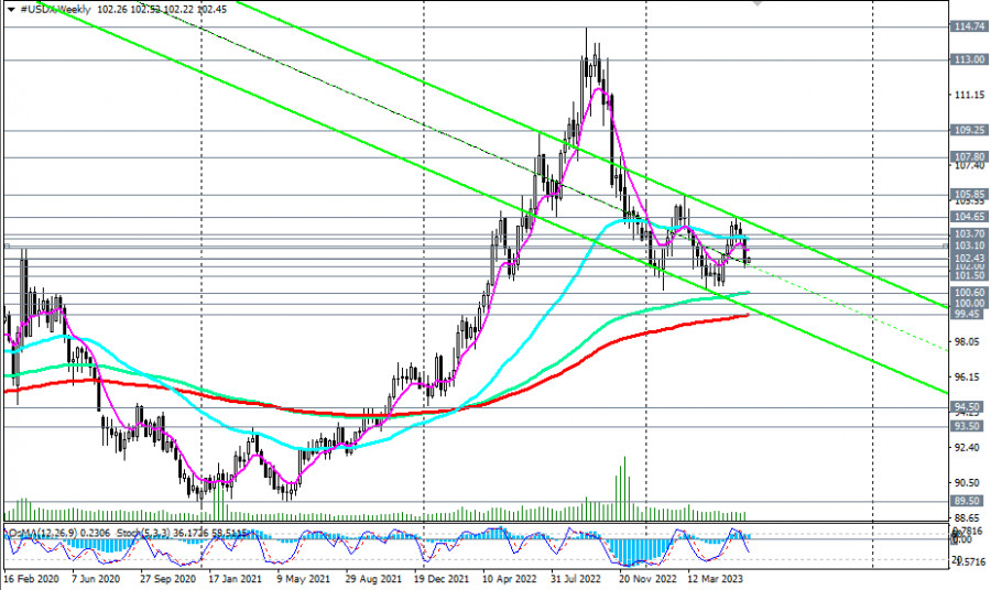 Доллар: краткие итоги и ближайшие перспективыИнстаФорекс - Instaforex, 2 года назад Доллар сильно снизился по итогам минувшей недели. Участники рынка негативно отреагировали на решение ФРС сохранить уровень процентной ставки без изменений, хотя, такое решение было ожидаемо. Несмотря на предупреждения со стороны руководства ФРС о том, что оно готово вернуться к «ястребиной» риторике, если того потребует экономическая ситуация, продавцы доллара воспользовались нейтральным решением по поводу процентной ставки, что привело к падению его индекса DXY ниже отметки 101.60. Всего же, за последние 3 торговые недели индекс доллара потерял 2,9% по отношению к 11-недельному максимуму, достигнутому в самом конце прошлого месяца на отметке 104.61. Тем не менее, некоторая фиксация коротких позиций по доллару началась еще в конце минувшей пятницы. Несмотря на снижение, инфляция всё ещё далека от целевых значений регулятора в 2,0%. Согласно представленным в начале прошлой недели данным, в мае годовой показатель CPI замедлился до 4,0% (против 4,9% месяцем ранее), а базовое значение CPI, исключающее из расчётов стоимость топлива и продуктов питания, составило 5,3% (против 5,5% месяцем ранее). Теперь участники рынка, следящие за котировками доллара, будут внимательно изучать тексты выступлений главы ФРС Пауэлла в Конгрессе, намеченных на среду и четверг (в 14:00 GMT). Кроме Пауэлла также на этой неделе дадут свои комментарии несколько представителей FOMC ФРС. Ожидается, что все представители руководства ФРС, включая самого Пауэлла, могут просигнализировать о возможности очередного повышения процентной ставки уже в июле. В настоящий момент рынок ожидает еще 2 повышения до конца этого года. В ФРС подтвердили, что инфляция остается повышенной, и что необходимо ее возвратить к целевому уровню 2%. При этом, сводка экономических прогнозов повысила прогноз конечной ставки на конец 2023 года до 5,6% (с предыдущего прогноза 5,1% в марте), а прогноз ставки на конец 2024 года - до 4,6% с 4,3% ранее. Другими словами, руководители ФРС считают разумным сделать еще 2 повышения процентной ставки в этом году и ожидают более высоких темпов роста ВВП в 2023 году, снижения уровня безработицы и меньшего прогресса в отношении базовой инфляции, чем они предполагали в марте. Комментируя перспективы монетарной политики после решения ФРС, ее глава Джером Пауэлл подтвердил приверженность руководства ФРС к проведению жесткой политики и к дальнейшему повышению процентной ставки. "Почти все политики (в ФРС) считают целесообразным дальнейшее повышение ставок в этом году", - сказал Пауэлл. Сегодня же публикации важной макро статистики в календаре не запланировано, а в США национальный праздник - День отмены рабства. В связи с этим, объемы торгов и активность инвесторов будут минимальны. Тем не менее, на тонком рынке покупатели доллара могут пойти в наступление. В связи с этим, предполагаем вход в длинные позиции по доллару во всех мажорных долларовых валютных парах. Стопы – выше/ниже сегодняшних внутридневных максимумов/минимумов. Что касается индекса доллара, то, с технической же точки зрения, индекс DXY (CFD #USDX в терминале МТ4) после прорыва ключевого среднесрочного уровня поддержки 103.70 (ЕМА200 на дневном графике) продолжает снижаться внутрь нисходящего канала на недельном графике, двигаясь в сторону ключевых долгосрочных 