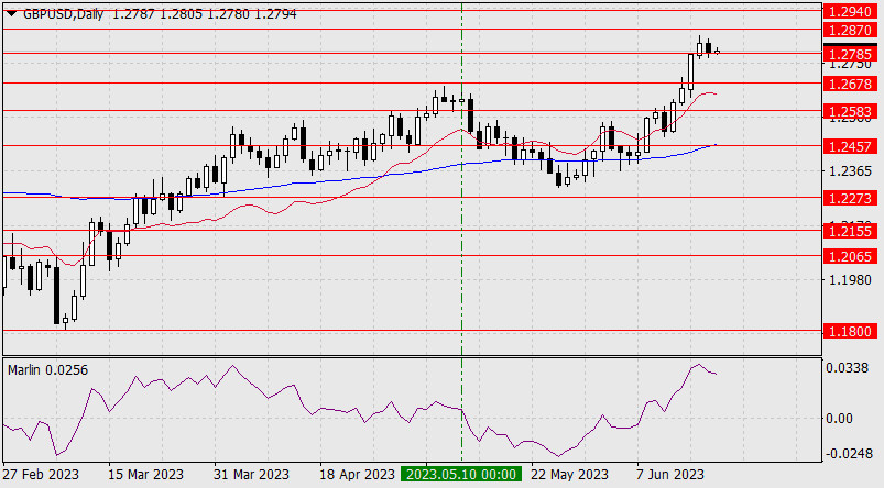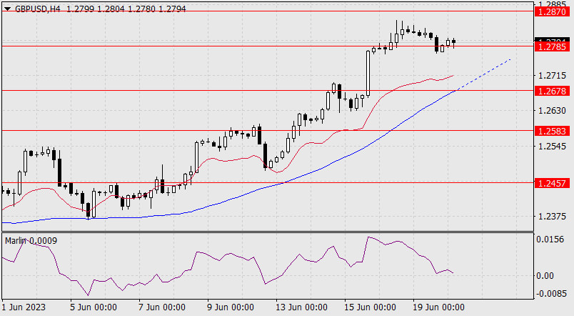 Осциллятор Марлин показывает разворот, пусть и не из зоны перекупленности, но всё же повышает вероятность нисходящего сценария. Закрепление под 1.2785 открывает путь до 1.2678 (вершина 10 мая). Здесь будет решаться дальнейшее развитие цены на среднесрочную перспективу.
